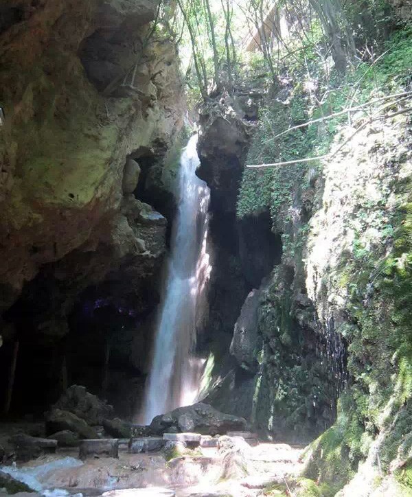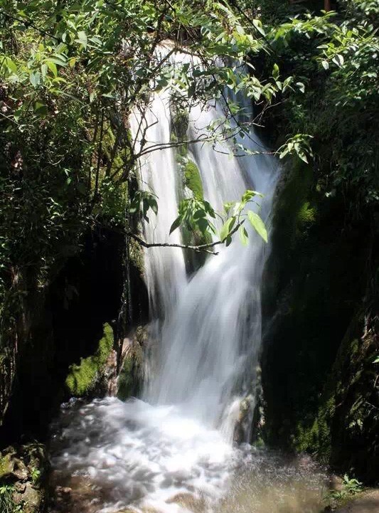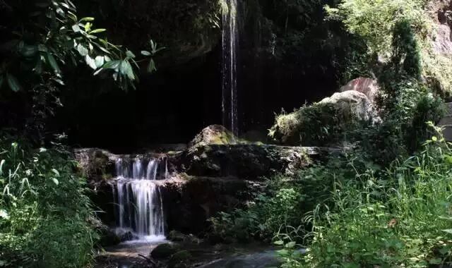 峡谷幽深处,一串珍珠似的瀑布帘子从岩石顶上垂落下来,潭下溪水清澈,鱼石可数。