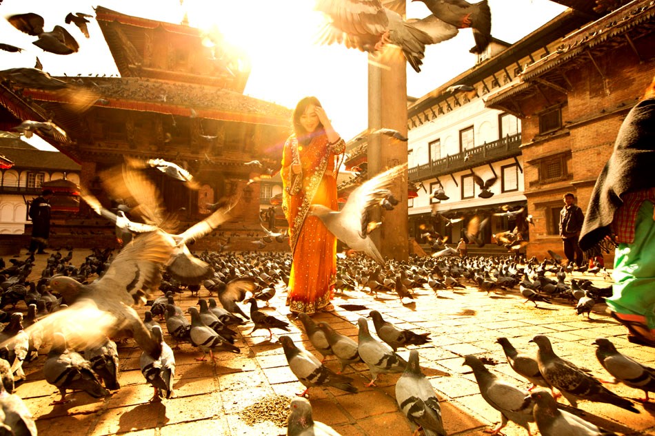 穿上当地艳丽的民族服装,和夕阳、鸽子来张合影,一定是你尼泊尔之行中诸多场景中,最经典的一张。