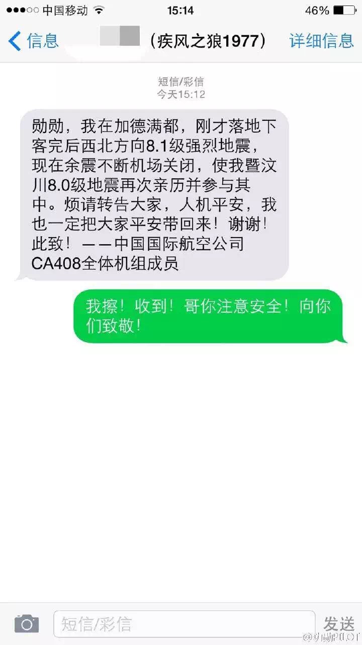 ▲网友@功勋PILOT 接到国航CA408机组乘务组同事报平安短信